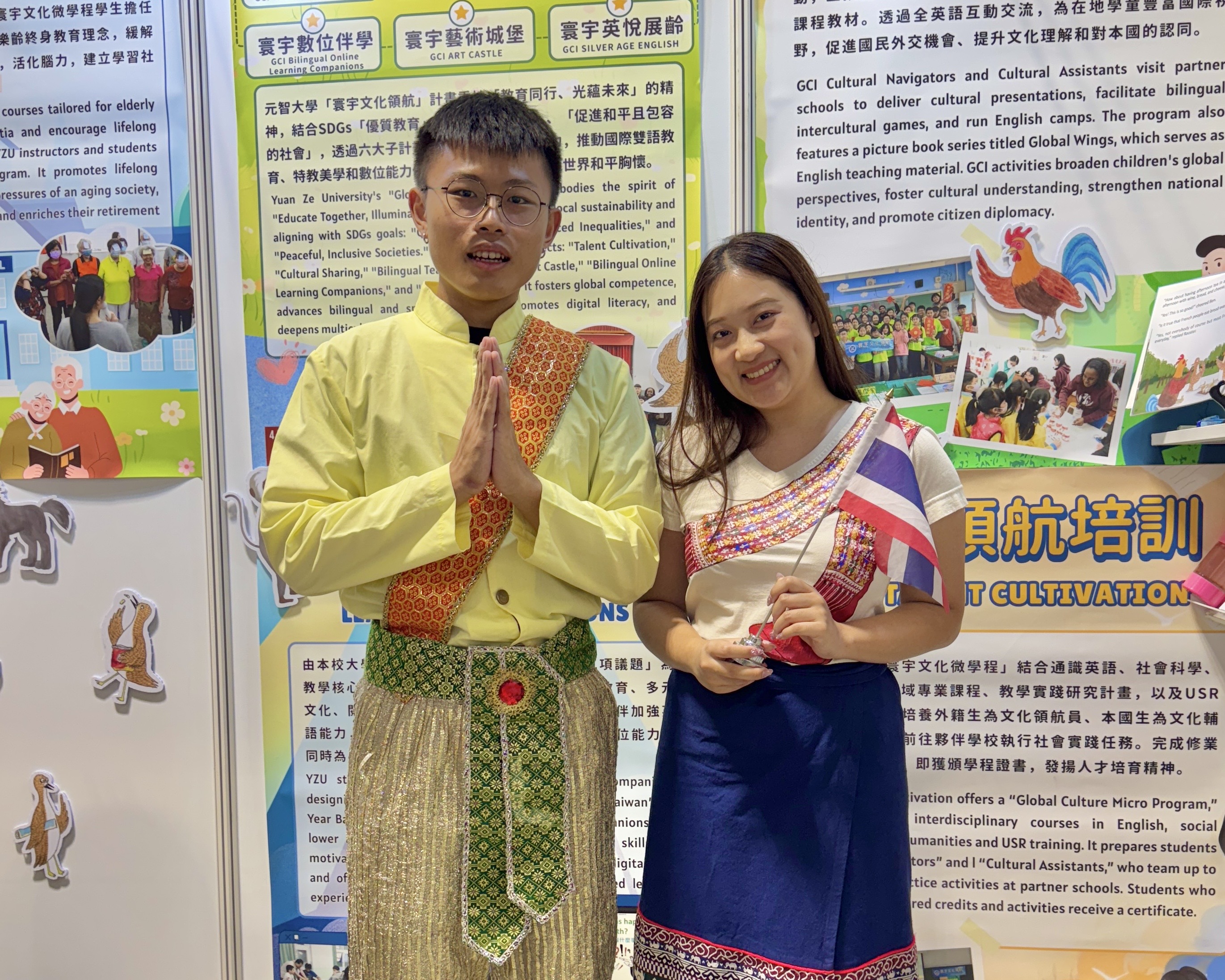 「寰宇文化領航」展區陳列「寰宇展翅」英語有聲繪本,由來自十三個國家的境外生親自撰寫,內容涵蓋各國風情和美食美景,並經專業外籍教授潤稿與配音,為在地推動全球視野、提升閱讀素養和促進國際理解。今年也特別安排異國服飾體驗區,包含泰國、越南、韓國、墨西哥等多國傳統服飾,邀請民眾體驗互動,親身感受異國的風采與魅力。計畫主持人黃郁蘭教授表示,「寰宇計畫已邁入第7年,除了與多國邦交大使館與桃園市教育局合作,也持續輔導更多夥伴成為雙語學校,落實國際教育,推動特教美學課程和銀髮族英語,將元智大學新雙語理念和社會責任的高教資源,與地方共享共榮。