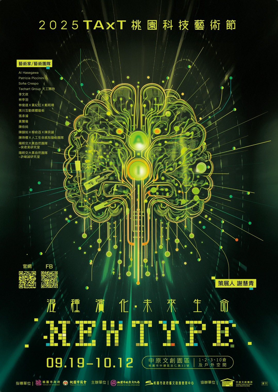 2025 「TAxT 桃園科技藝術節」以「混種演化・未來生命 New Type」為題,由策展人謝慧青策劃,於 9 月 19 日至 10 月 12 日在中原文創園區舉行,展覽時間為每日 10:00 至 18:00(休館日為 9/22、9/30、10/7)。