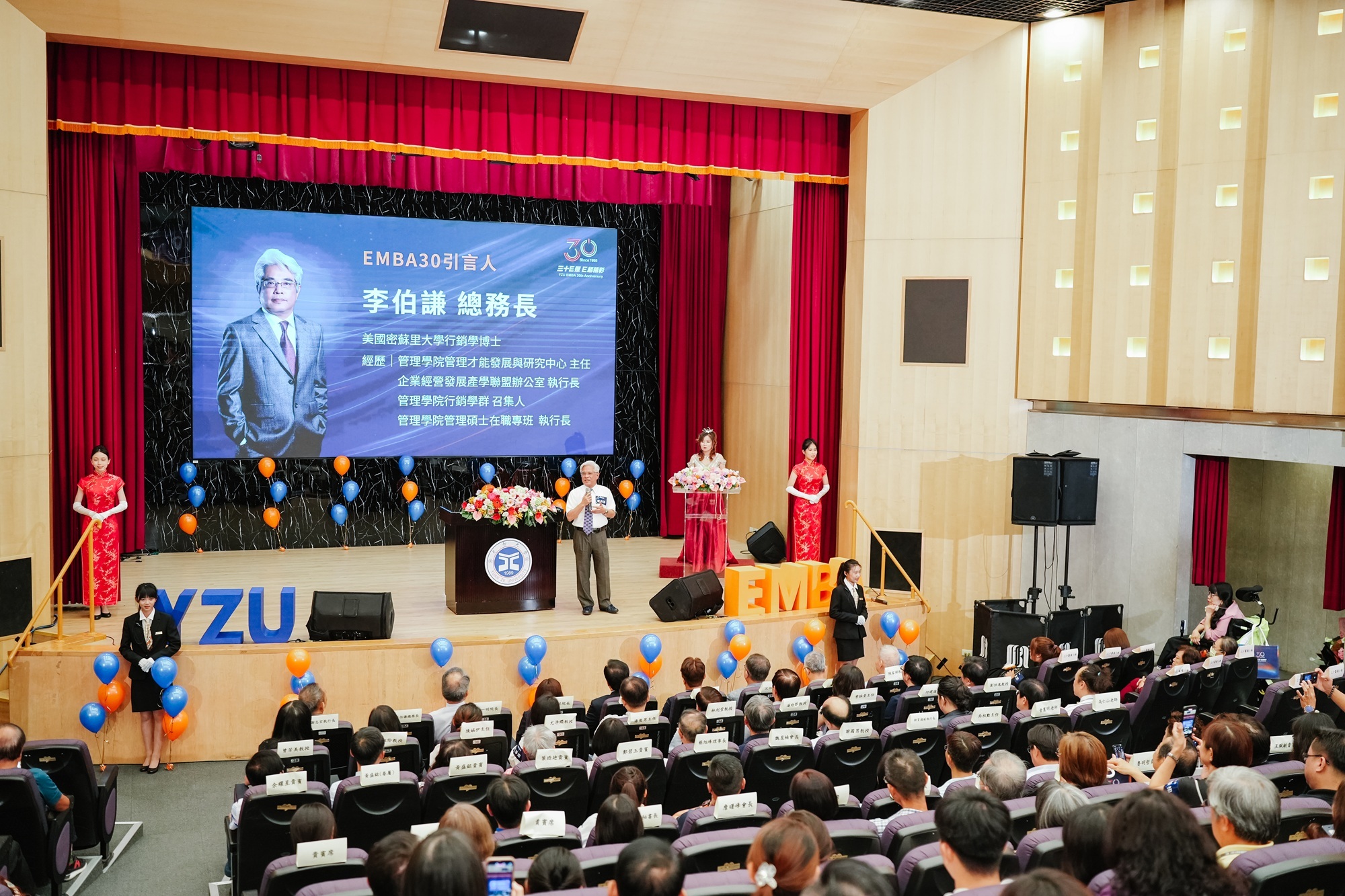 校長廖慶榮致詞肯定元智大學管理學院的遠見與勇氣率先成立EMBA專班,奠定台灣在職教育典範。院長黃敏萍回顧初辦時期,管研所尤克強所長的創辦維艱,並期許未來三十年持續開創新局。EMBA執行長羅懷均回顧,自1995年首屆僅八位在職生建言起步草創,1996年正式成立全台首個EMBA班,其後陸續拓展台北班及越南專班,並成立「企管菁英協會」、「元智EMBA聯誼會」、「元智EMBA校友會」等校友組織,串連歷屆校友情誼。他特別感謝歷任執行長、授課師長與所有校友,共同成就今日的榮耀。