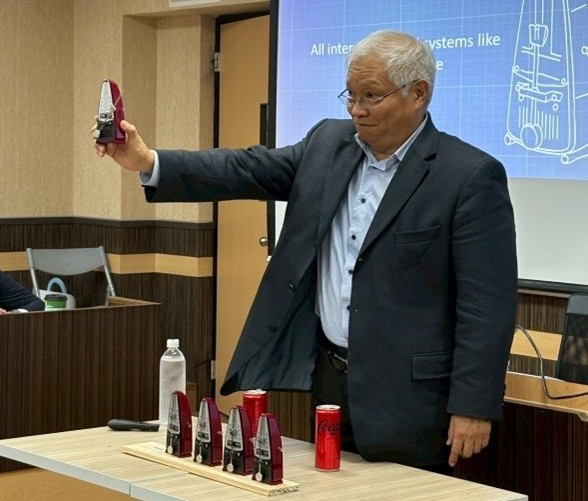 (鄭博士利用節拍器進行共振實驗/照片由管理學院提供)