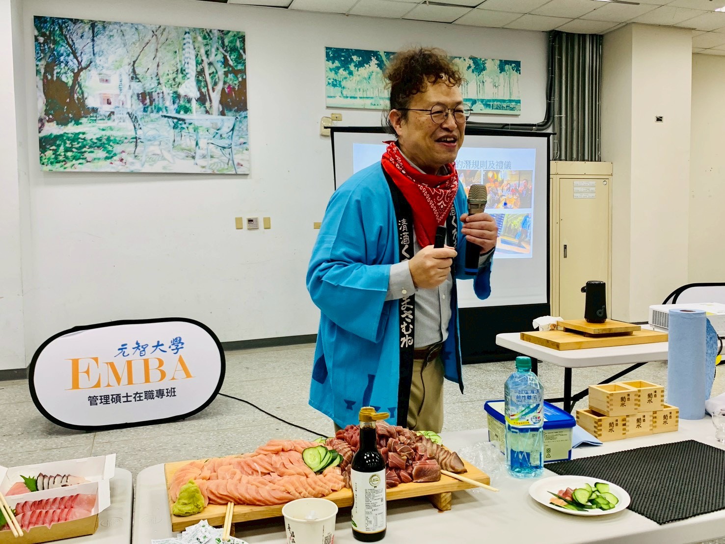 活動當晚,高仁山業師特別以清酒職人服裝現身,深入淺出介紹清酒的原料、釀造製程與風味辨識,引導學員從品飲體驗中延伸思考感受力、判斷力與溝通思維的訓練。現場並搭配生魚片等精緻餐食,讓學習情境更貼近實務與生活。同學與校友也自發準備多樣佳餚共襄盛舉,在餐桌交流與跨屆互動中,讓學習自然發生於分享與對話之間。