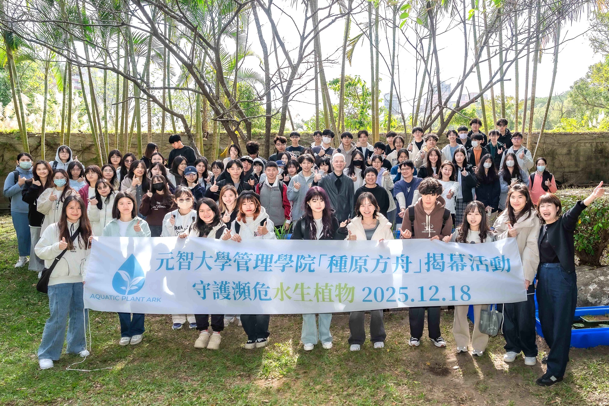 (元智大學管理學院「種原方舟」揭幕,師生與合作夥伴合影,見證復育成果/照片由管理學院提供)
