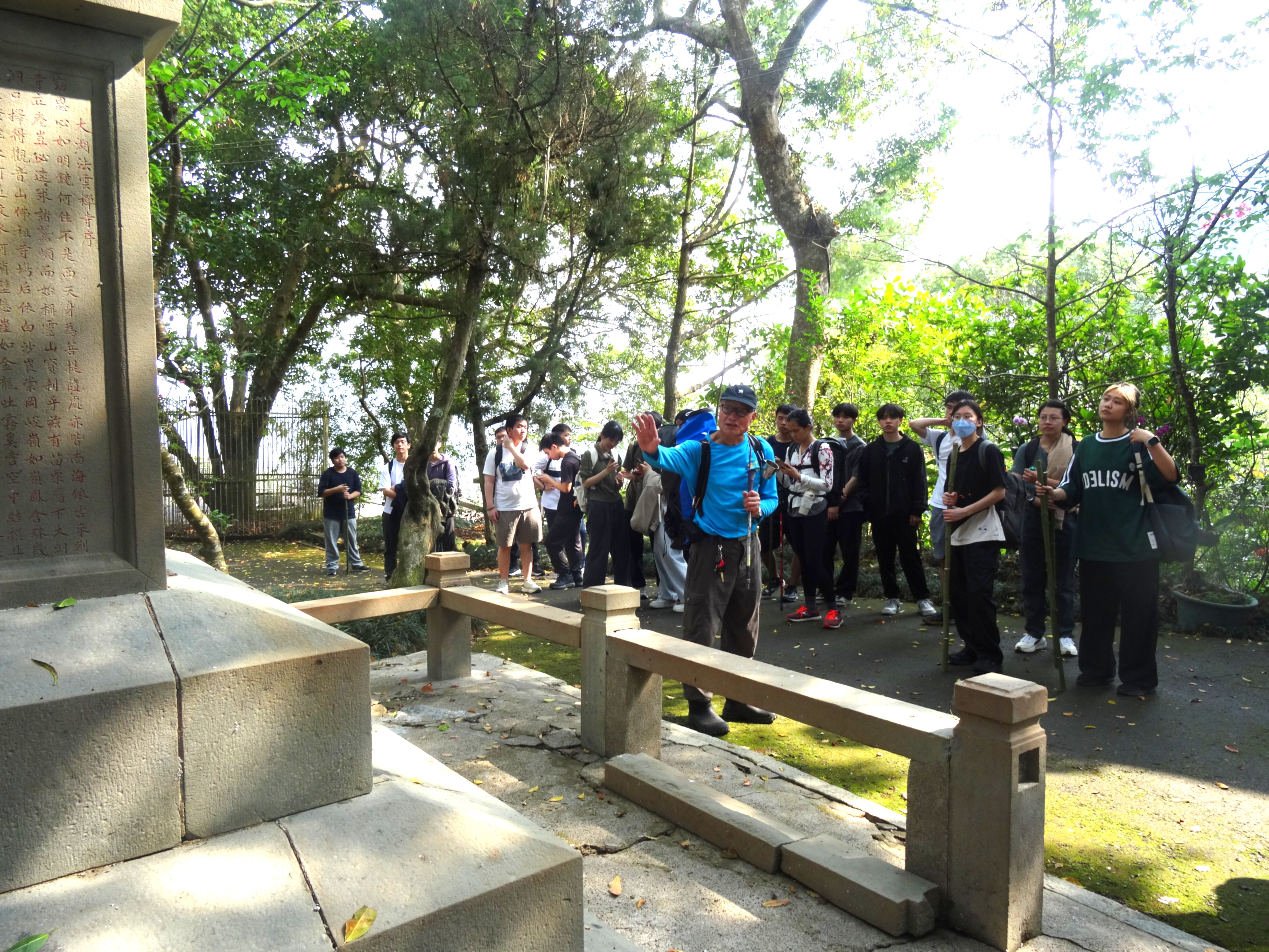 (嚮導詹老師向同學解說「大湖開闢紀念碑」/照片由許倩蓉提供)