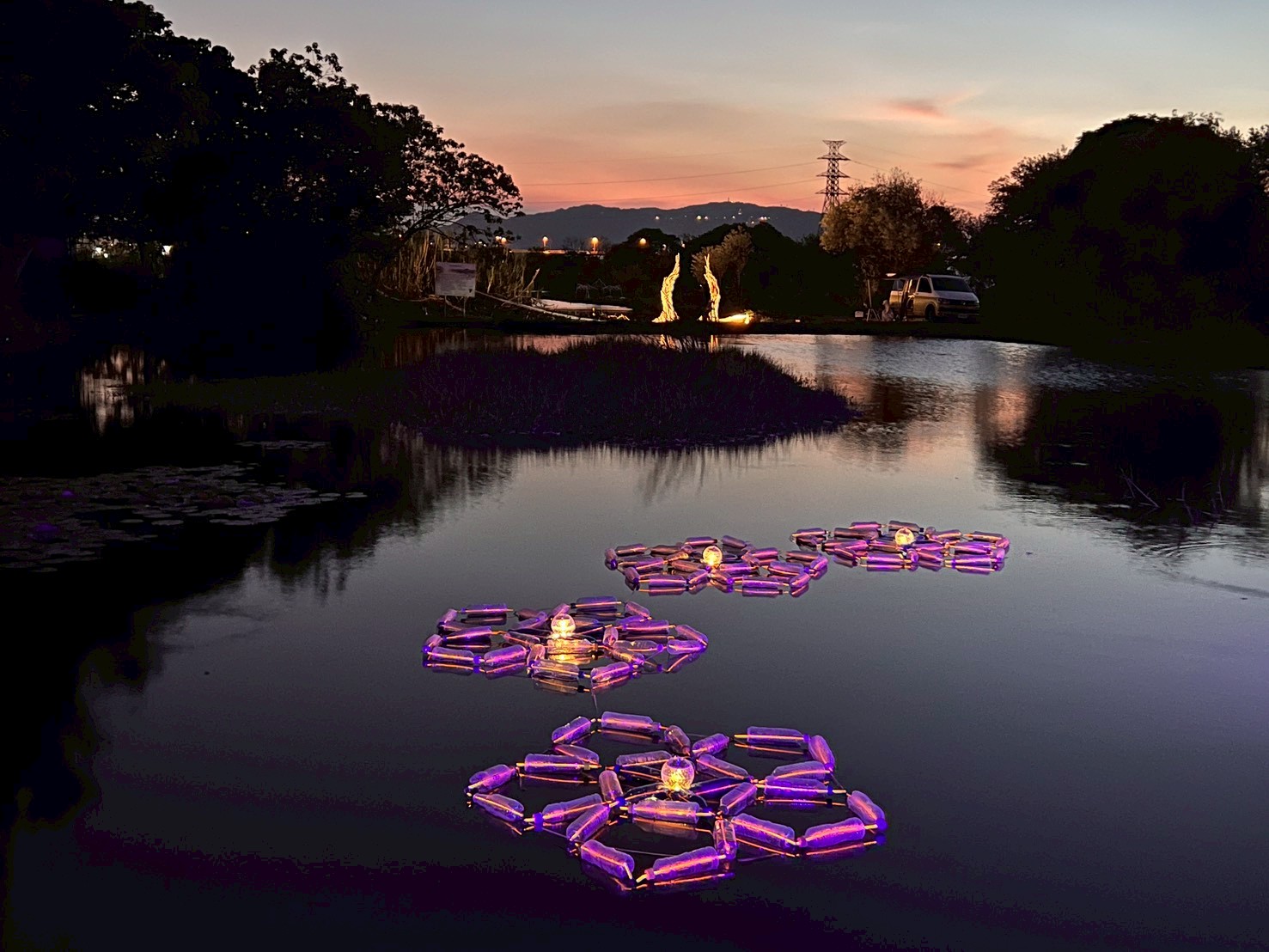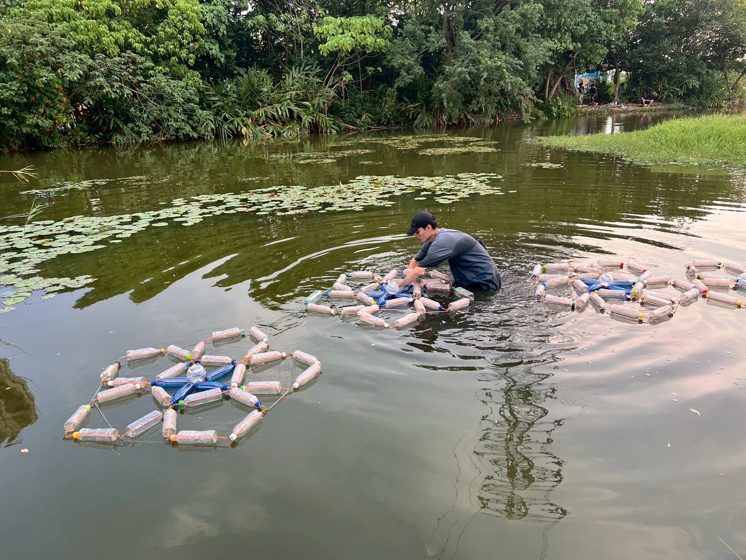 黃琬雯表示,作品靈感來自濕地常見的被子植物五瓣花與水生植物維管束切面,呈現自然中的幾何秩序之美。團隊以回收寶特瓶構築漂浮結構,並以螢光骨架連結出五邊形與十邊形的分形形式。白天,作品化為漂浮於水面的寶特瓶地景;夜晚,僅見閃爍微光的幾何花瓣在水面上綻放,象徵人工與自然的交融與共生。她指出,寶特瓶象徵城市消費循環,植物幾何代表自然生態的循環,兩者對立卻相互映照。這正是人與自然共存的縮影。