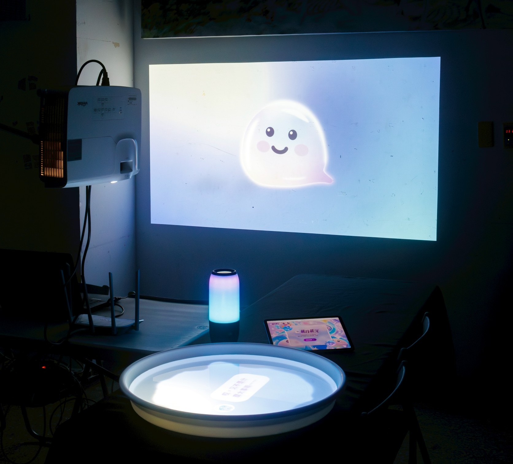另一件作品《載符載沉》由李峻宇、葛芝羽、江倖衣、小崎晃志郎、廖晨皓與張凱紹共同創作,指導老師為陳彥彰。作品以數位溝通中的情緒傳遞為核心,運用 emoji 作為情感符號,並結合 GPT-4o 技術,將文字與表情轉化為帶有情感色彩的回應。系統可生成專屬情緒小卡,並以水面投影的方式呈現,象徵情緒在數位世界的擺盪與流動,邀請觀者重新思考數位時代中情緒的閱讀與傳遞方式。